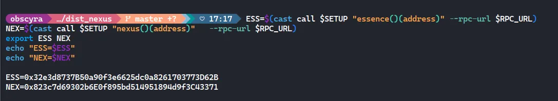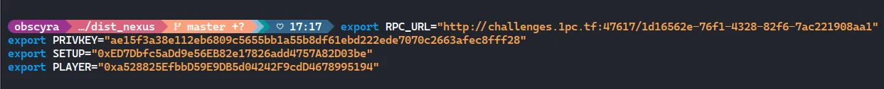I get a private key + wallet, and the Setup contract address. I export them first so we don’t keep copy-pasting: