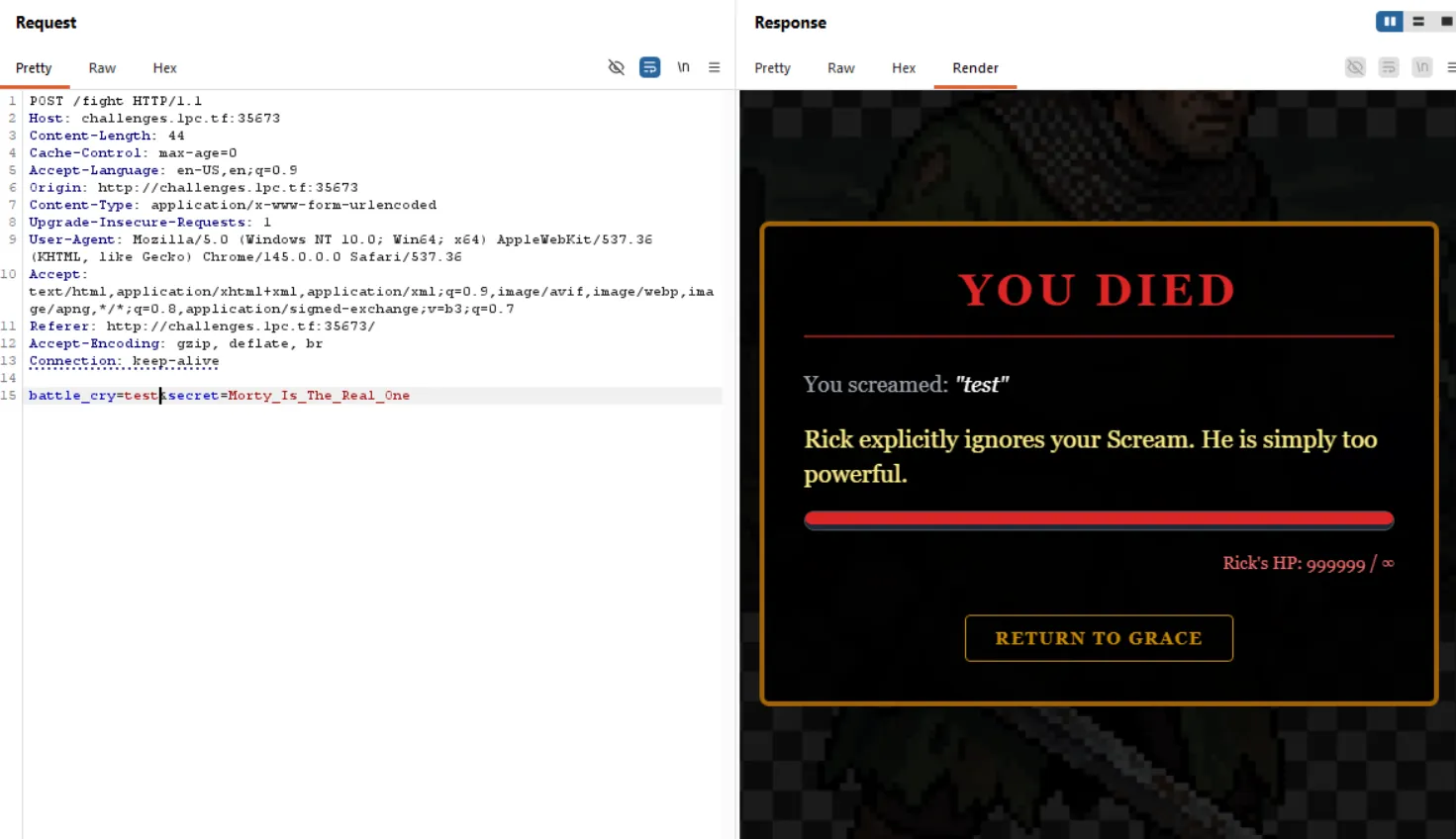 So now we already know the correct secret key for the /fight endpoint. That means the form field: