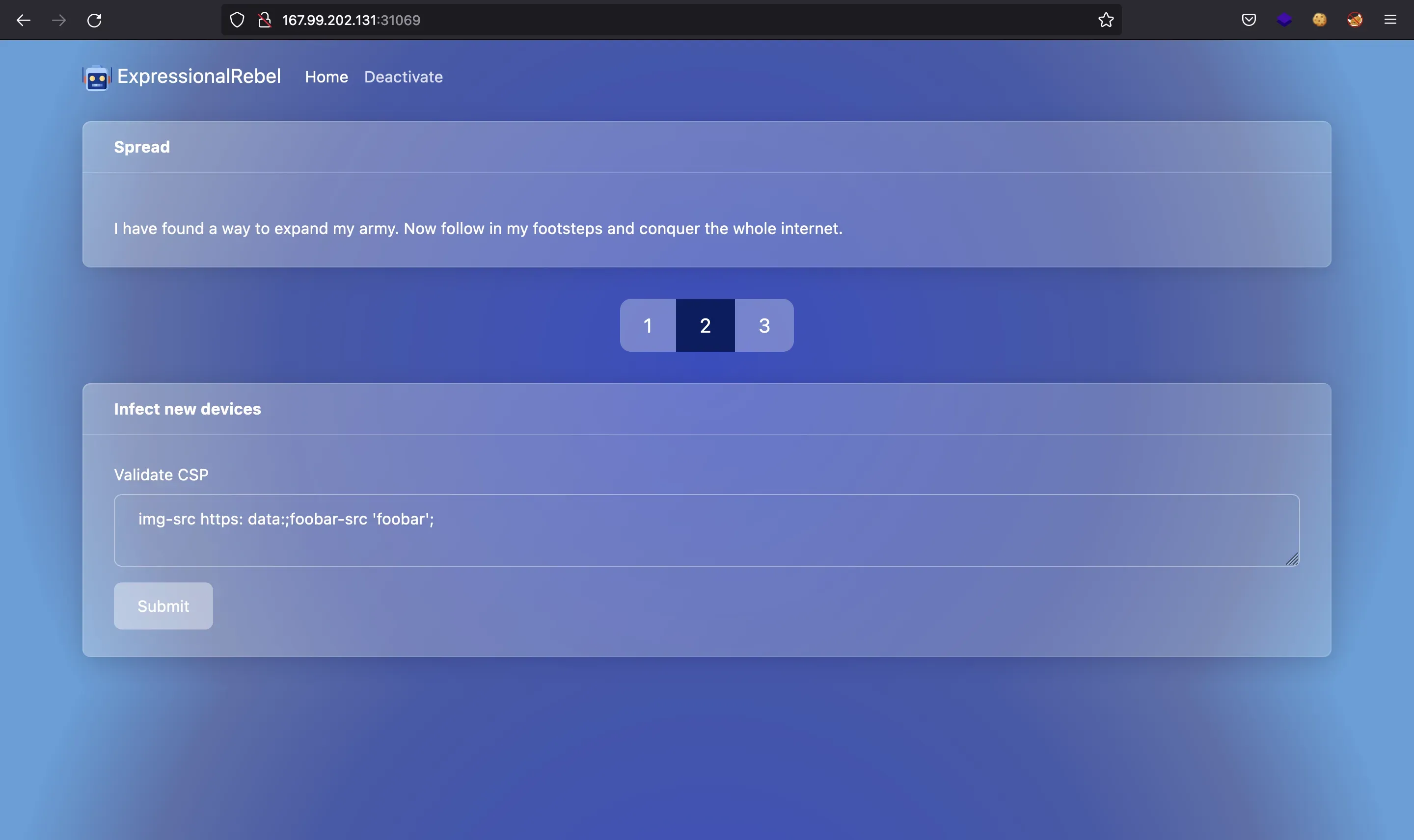Content-Security-Policy: report-uri http://0x7f000001:1337As we have the Node.js project and a Dockerfile, this could be tested adding some console.log to the code inside the Docker container, and it works. Now we can access /deactivate using a SSRF attack.